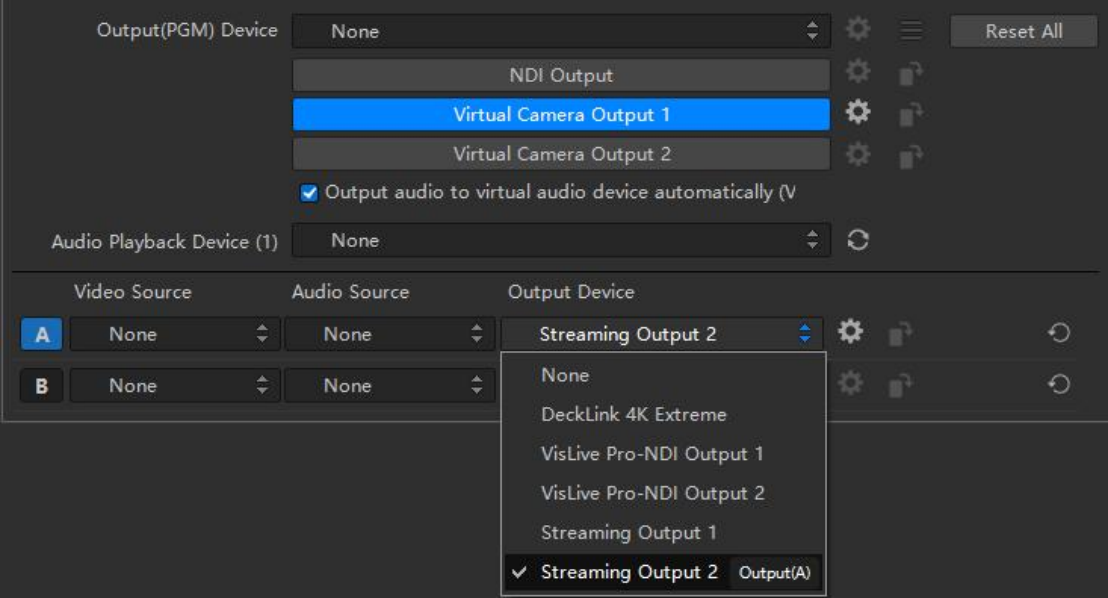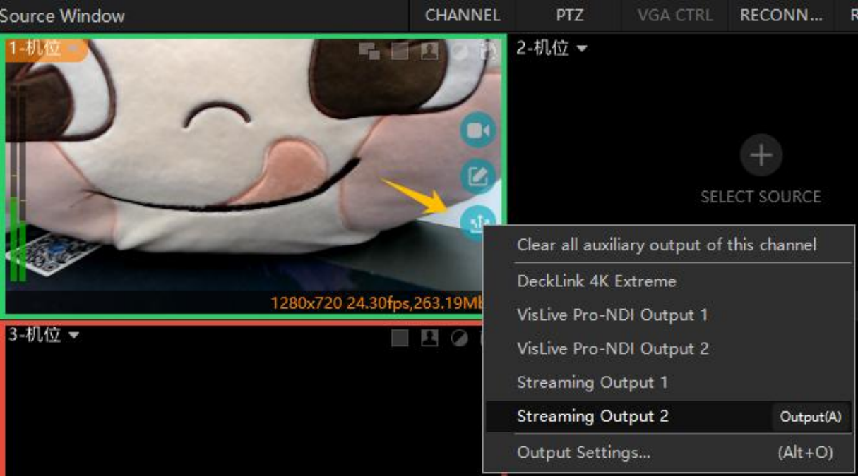 10. Direct Output Configuration: User can directly set auxiliary output to capture card, NDI, or streaming output from the signal source window.