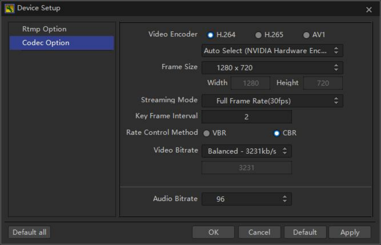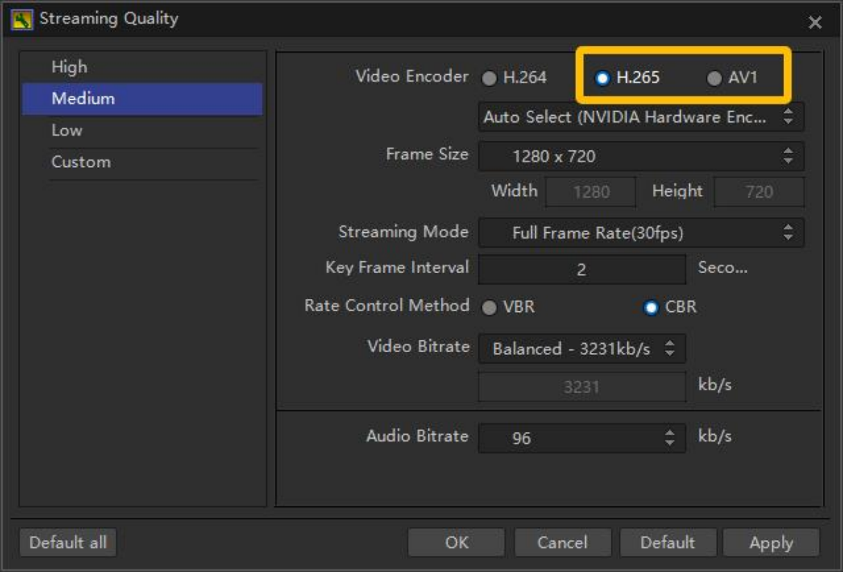 3. Added H.265 and AV1 encoding to meet various platform requirements. Users can select different encoders based on hardware conditions and configure encoding, resolution, bitrate, enhanced RTMP mode (H.265 only), and other options.