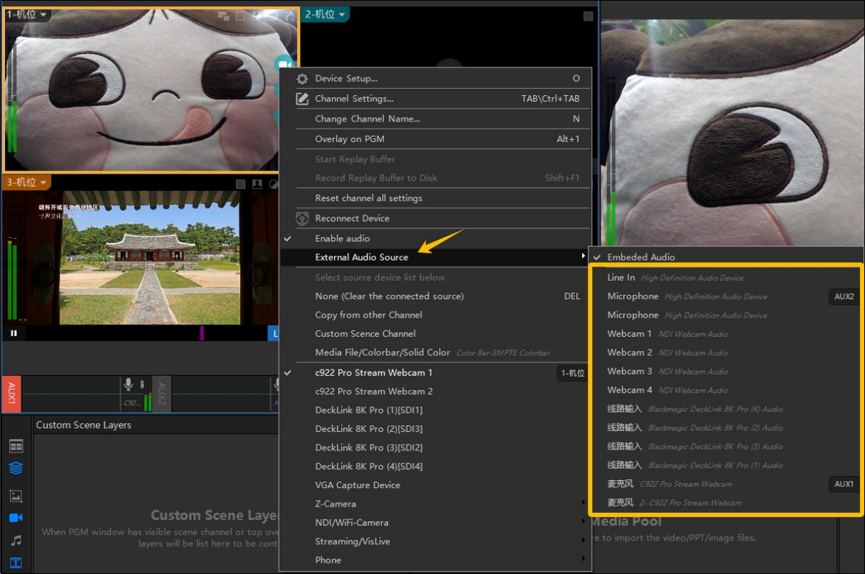 2. External Audio Source: Signal source can use embedded audio or specify an external audio source as the audio channel.