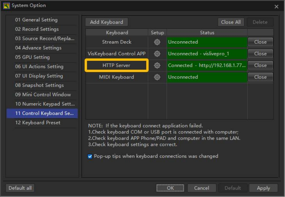 6. Added HTTP Server option to control VisLive Pro via command over a local network.